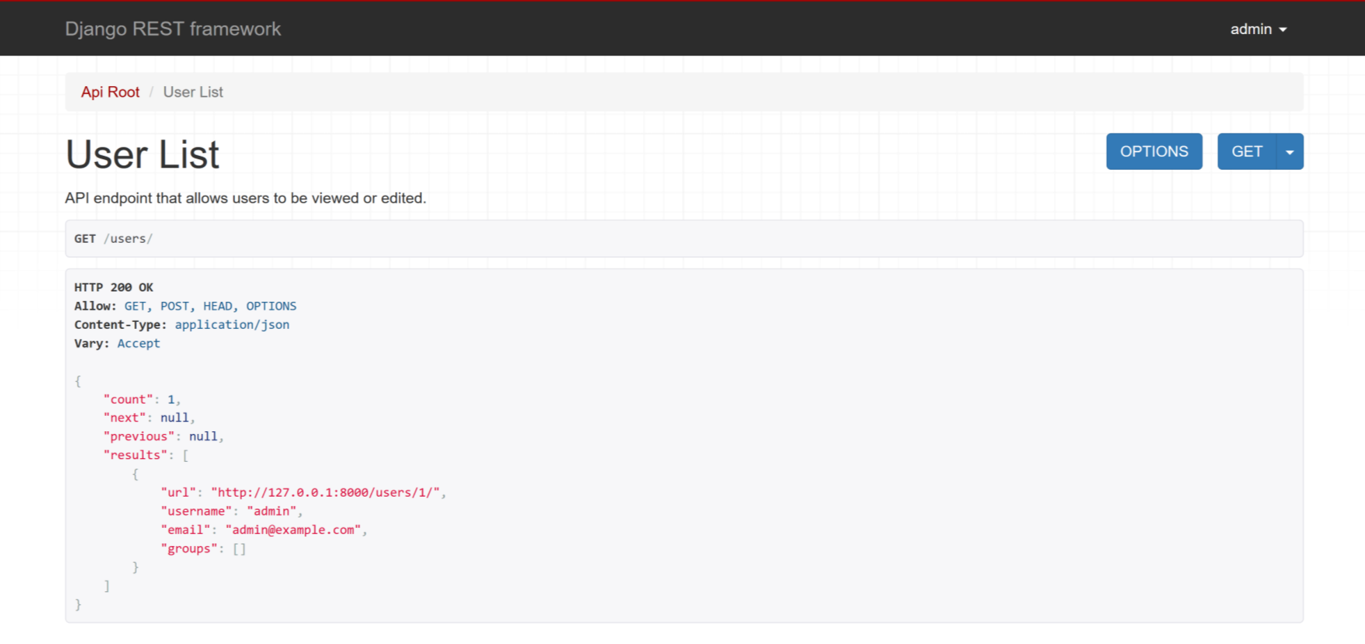 $ curl -H 'Accept: application/json; indent=4' -u admin:password123 http://127.0.0.1:8000/users/